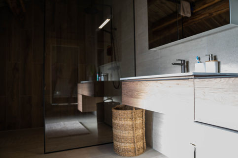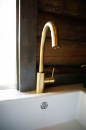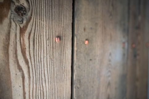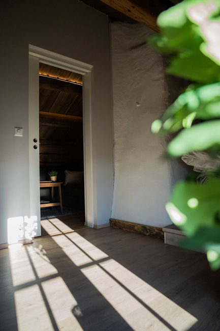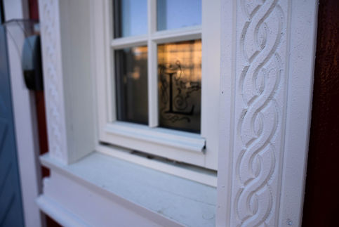 Mange detaljer og listverk er laget av gamle golvbord eller kløyvd tømmer for å ta vare på, og synligjøre gamle materialer.